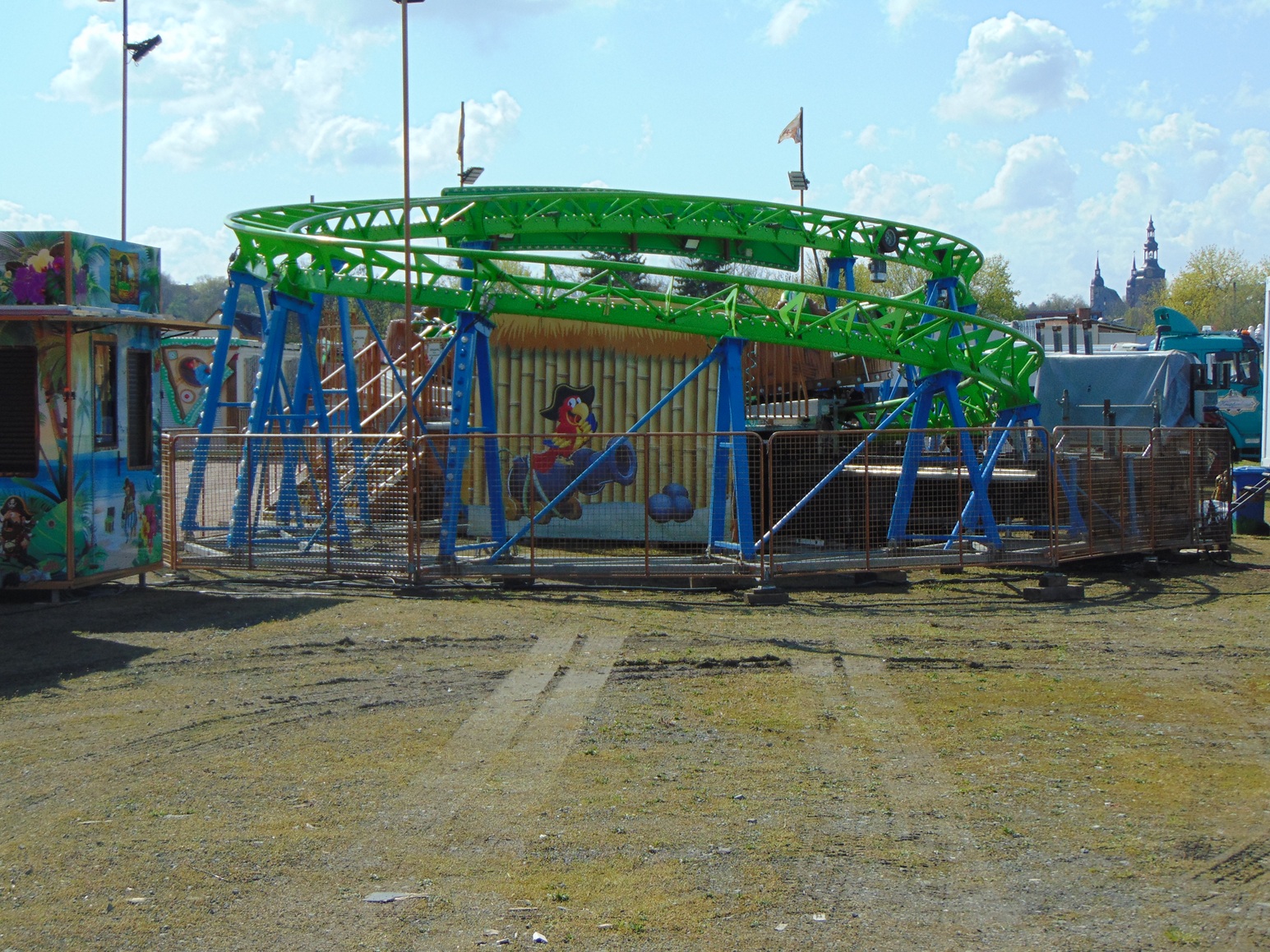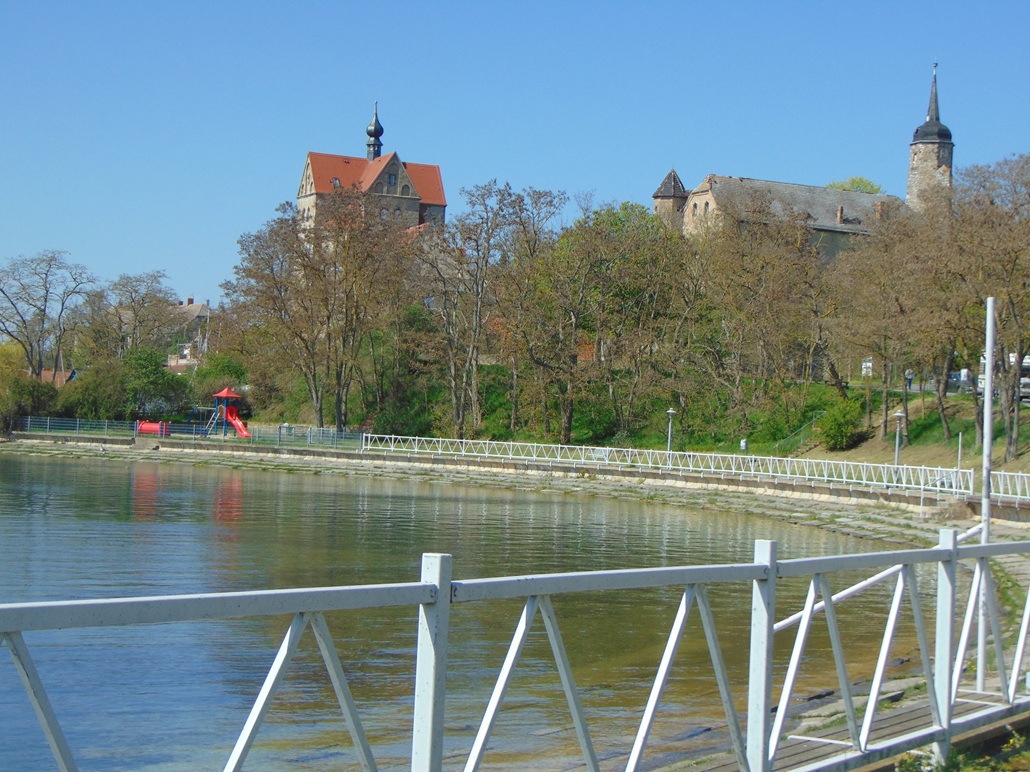 Von nun an lief es super, das Rad rollte, am Himmel gab es strahlenden Sonnenschein. Vorbei am Schloss in Seeburg, entlang des Süßen See, Eisleben kurz gestreift über das Gelände der Eisleber Wiese. Hier begann gerade der Aufbau für die Eisleber Frühlingswiese (30.04.-03.05.2026). Und dann kam doch noch eine Schwierigkeit. Der Weg in Richtung zum Tagesziel, dem ich laut Google Maps folgte, führte durch Wiesen und Felder. An einer Stelle wurde dieser Weg dann fast zum Albtraum. Auf einer Länge von ca. 800 m war der Feldweg total matschig vom Regen mit tiefen Löchern und Rillen voll Wasser, die von Traktoren zerfahren waren. Zum Glück konnte ich an den schwierigsten Stellen auf einen sehr unebenen holprigen schiefen Wiesenstreifen von etwa 1 m Breite zwischen Feldweg und Acker ausweichen. So kam ich teilweise zu Fuß das Rad schiebend über dieses „Hindernis“ hinweg.