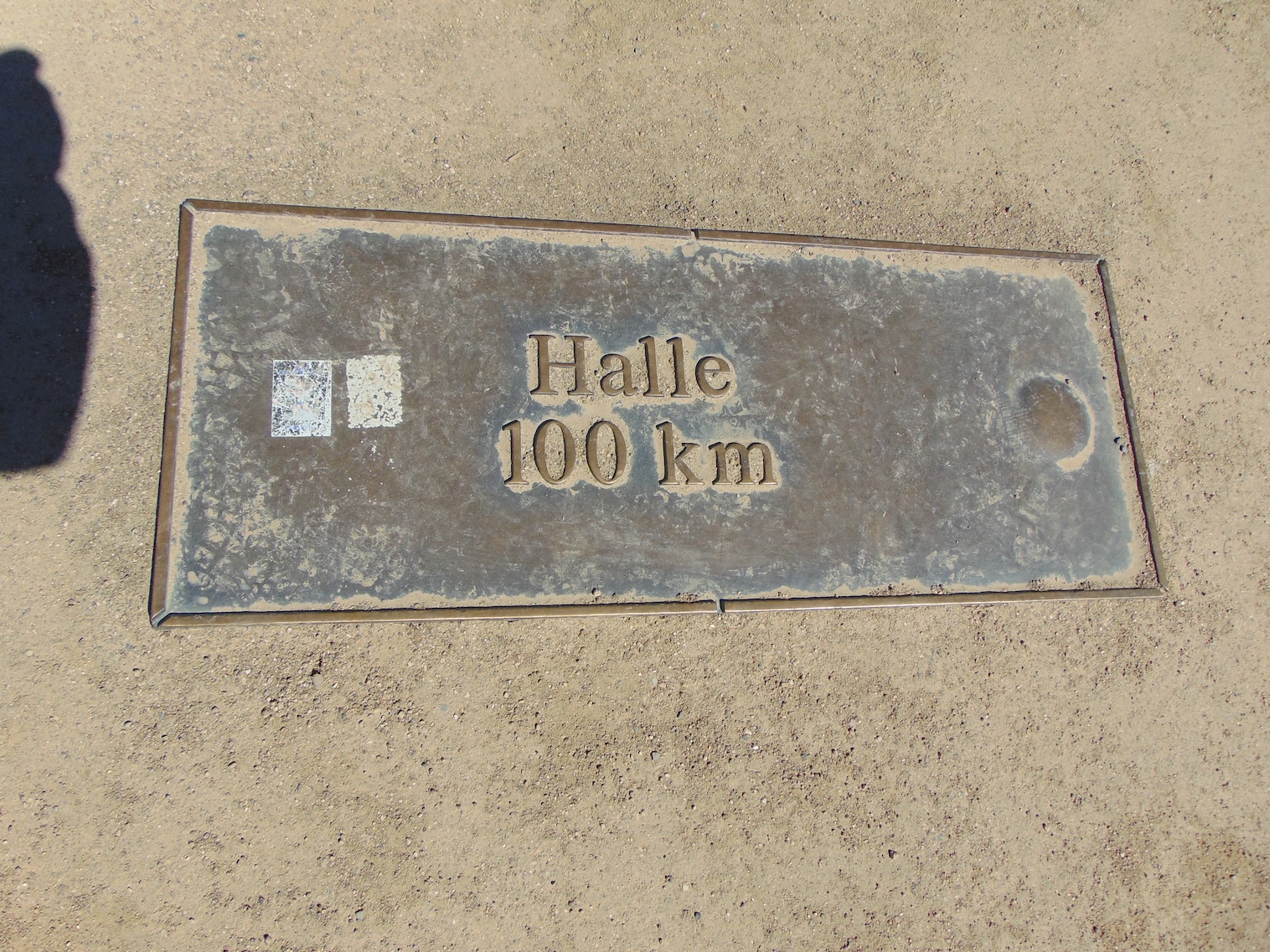 Und so kam ich oben an, genoss das Geschaffte und ließ mich am Gipfelstein mit meiner „Erfolgsprämie“ fotografieren. Ich hatte nicht den Plan, diese gefüllt wieder mit runterzunehmen. Und so setzte ich mich gemütlich hin und füllte die Flüssigkeit aus der Flasche in meinen Körper. Das tat gut. Und dann fotografierte ich noch einen „wichtigen“ Entfernungsanzeiger.