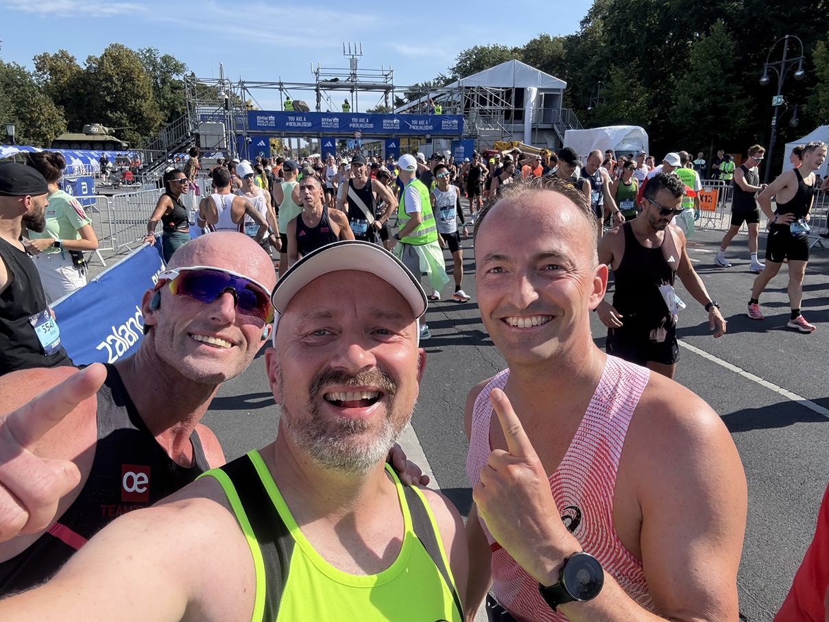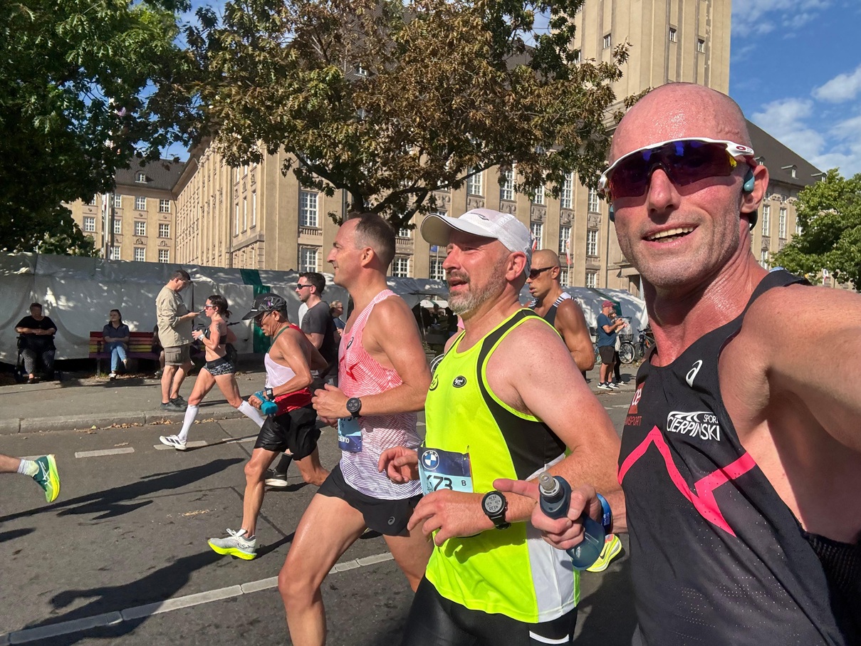 Also hieß es: Viel Trinken, cool bleiben und die Angangspace etwas drosseln. Gesagt getan, meine beiden Begleiter Falk Cierpinski, Frank Renner und ich hatten vor dem Start so viel getrunken, dass wir kurz hinter der Siegessäule erstmal eine gemeinsame Pinkelpause einlegen mussten. Die nächsten 5 Kilometer brauchte ich, um mich mental an die Wärme zu gewöhnen. Kurz vorm Friedrichstadt-Palast grüßte Lauflegende und LAV-Mitglied Torsten Matthes mit Kinderwagen am Straßenrand, von da an lief es besser. Die Pace pegelte sich bei 4:25 Min/km ein und das Ganze kam ins Rollen. An den Getränke-Stationen nahm ich 4 Becher statt wie üblich 2 und irgendwie spielte die Wärme dann kaum noch eine Rolle. Auf den zwei leicht ansteigenden Kilometern vor dem Wilden Eber nahmen wir noch etwas Pace raus und konnten es die letzten 10 Kilometer bis zum Ziel wieder laufen lassen. – Am Ende stand die 3:10, irgendwas zwischen Harry Styles und André Schürrle, und ich war in Anbetracht der Temperaturen sehr zufrieden damit.